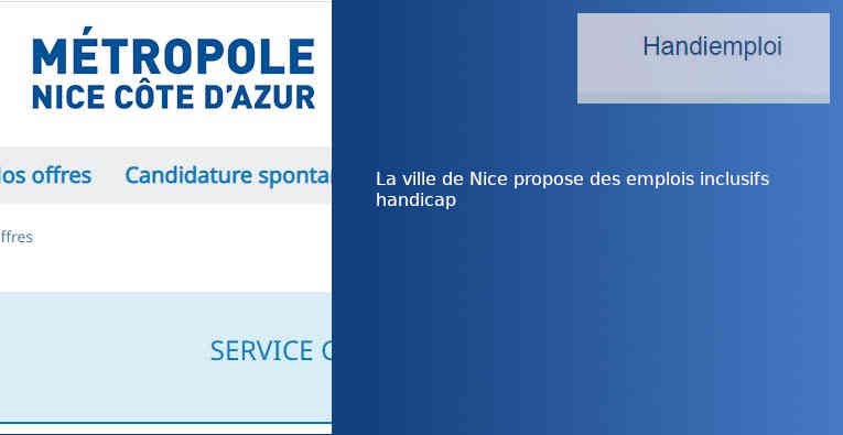 Le courant national de l'intégration des personnes invalides en emploi ordinaire est respecté dans le service R.H. de la ville de Nice. Les emplois ouverts incapacité sont une nécessité afin de stopper l'exclusion et les préjugés des problèmes de santé en France. Une personne sur deux es ...